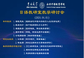 为进一步做好新一轮本科教育教学审核评估自评自建工作,促进本科教育教学高质量发展,按照学校要求及学院新学期工作会议精神,公共外语教育学院日语教研室于2024年4月1日晚8时顺利召开了教学研讨会。由于本教研室教师的教学任务分布在各个时间段,本次会议采取线上会议模式。