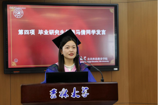 毕业研究生代表马倩同学回顾了在公共外语教育学院度过的青春岁月,感慨万分。她感谢学院领导和老师们的辛勤付出和无私奉献,正是他们的关怀和教导,让她从一个青涩的学生成长为一名有务实奋进的青年。2024届毕业生将永远铭记这段美好的时光,并祝愿学院未来更加繁荣与辉煌