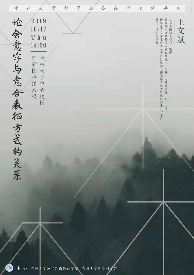 报告题目:论会意字与意合表征方式的关系报 告 人:王文斌教授 北京外国语大学讲座时间:2019年10月17日 下午14:00讲座地点:中心校区鼎新图书馆8楼学苑沙龙主办单位:米兰体育平台,米兰体育(中国) 吉林大学社会科学处