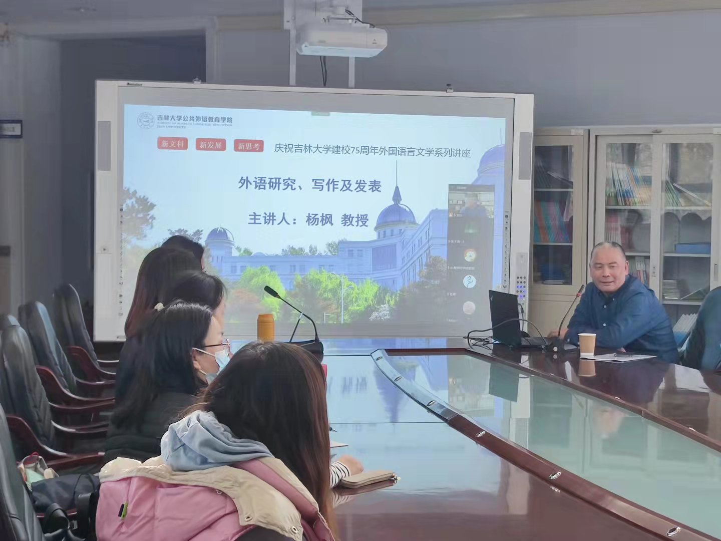 2021年10月13日,上海交通大学外国语学院教授、《当代外语研究》主编杨枫教授应邀访问我院,并在外语楼六楼报告厅举办了题为“外语研究、写作及发表”的学术讲座。该讲座为我院“新文科、新发展、新思考”庆祝吉林大学建校75周年外国语言文学系列讲座第一场。本次讲座由院长潘海英教授主持,张锦副院长和我院教师、研究生共同参加了本次讲座。