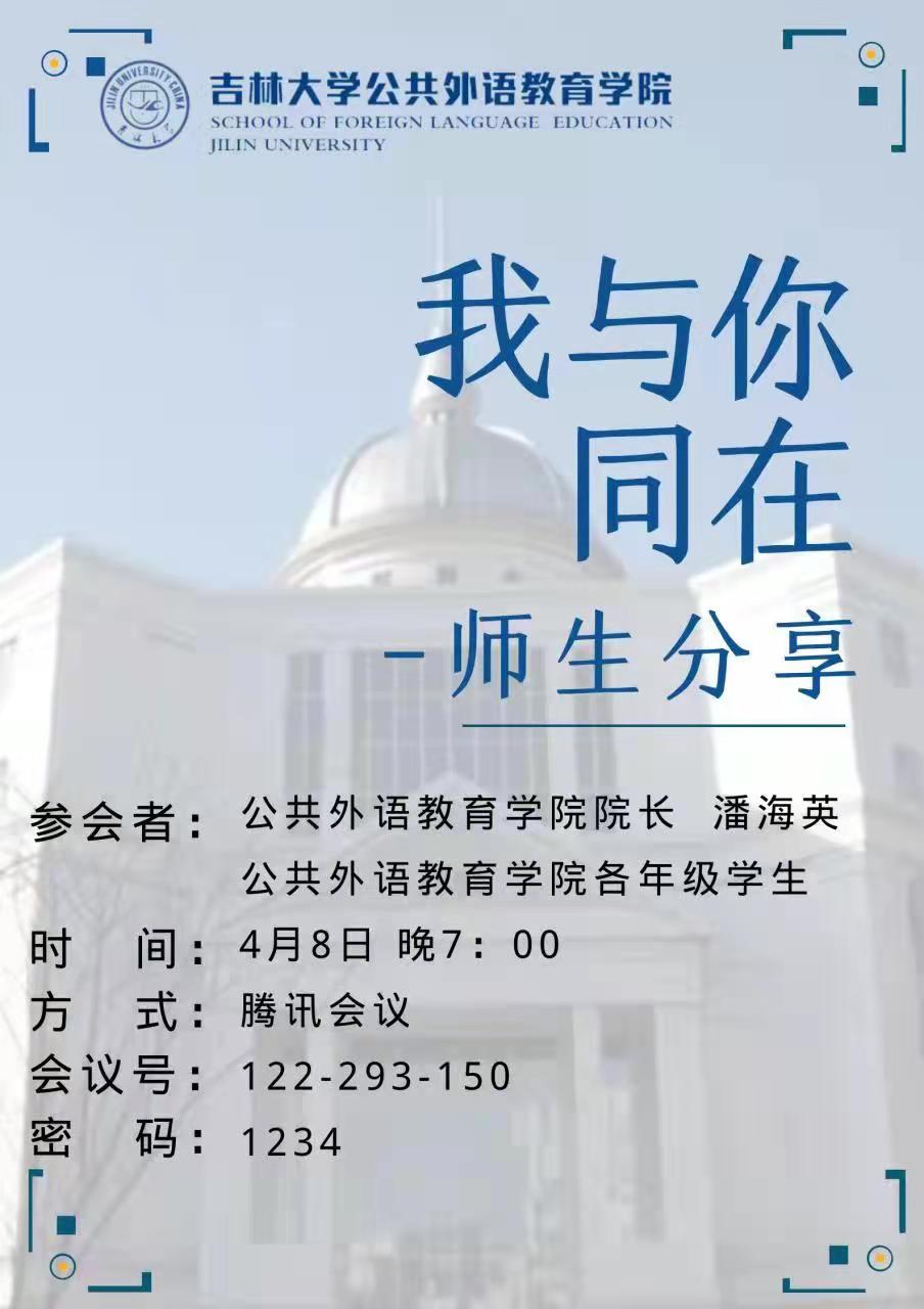 202248日,公共外语教育学院线上举办了“心理引航”计划——“我与你同在”师生分享会。本次会议邀请了公共外语教育学院院长潘海英教授、党委副书记徐杰老师参加,会议由研究生辅导员曾媛主持,全体硕士研究生参会。