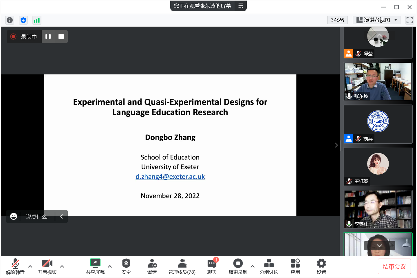 应米兰体育平台,米兰体育(中国)邀请,国际知名应用语言学学者、英国埃克塞特大学Zhang Dongbo教授,于2022年11月28日在线上进行专题学术讲座。讲座由副院长张锦教授主持,校内外广大教师和学生参加了此次讲座。