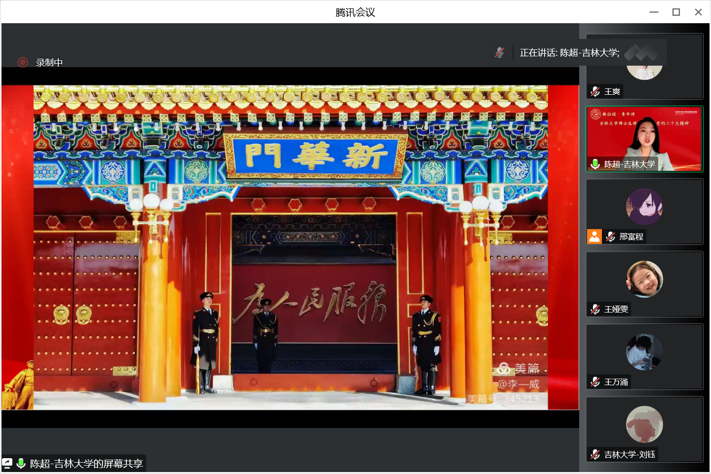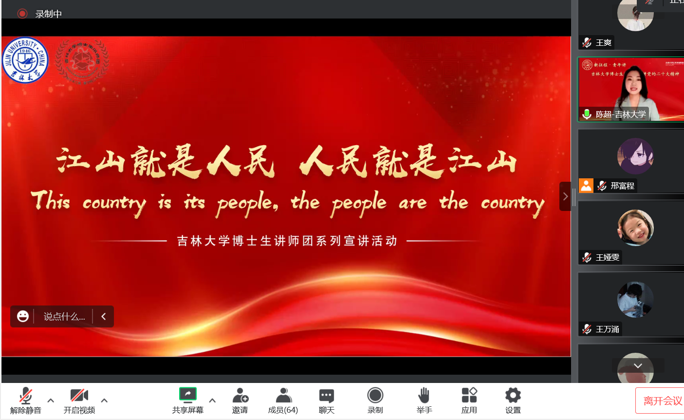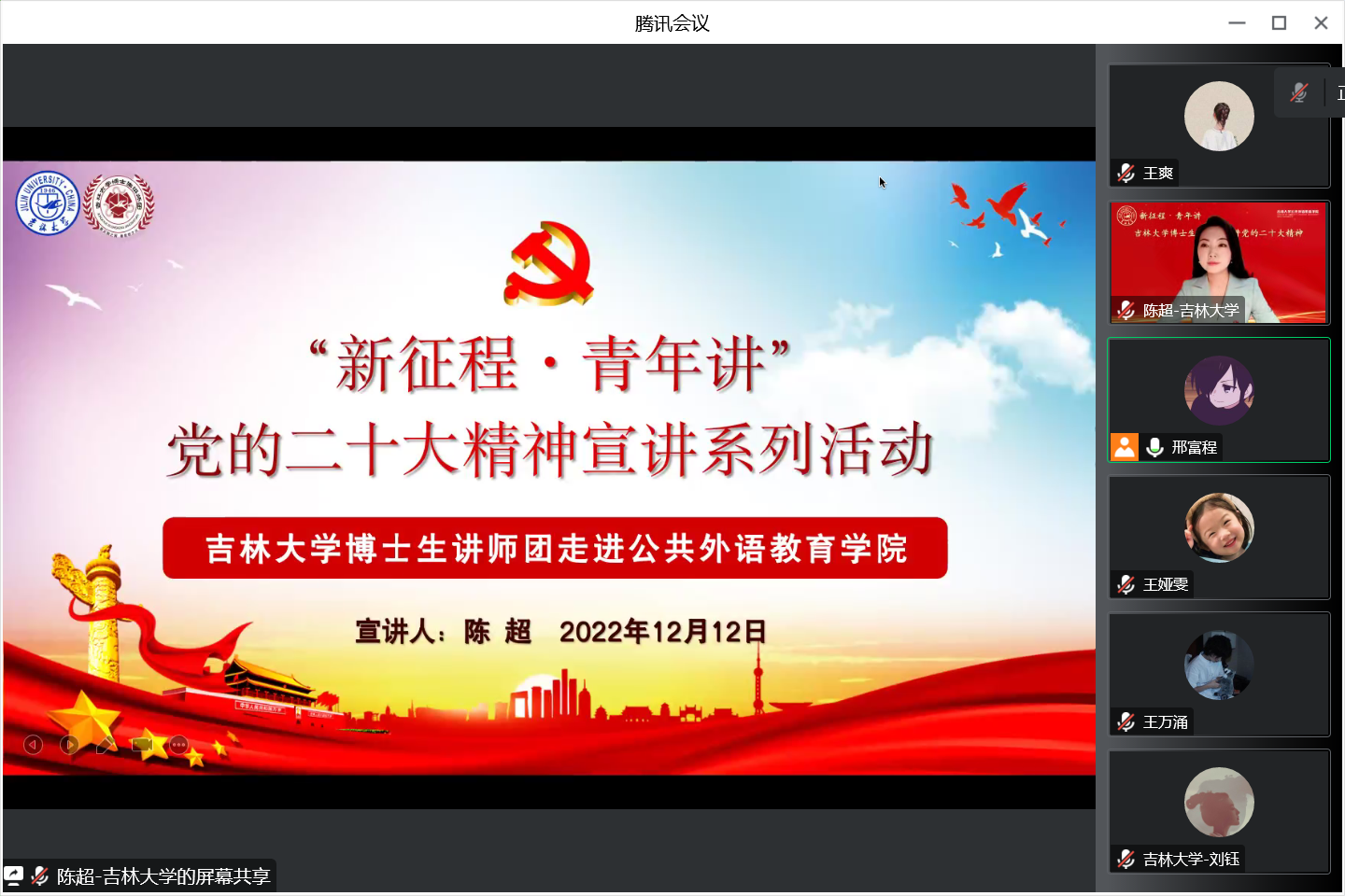 为深入学习贯彻党的二十大精神, 用党的科学理论武装青年用党的初心使命感召青年强化爱国爱党意识2022年12月12日博士生讲师团走进我院研究生三个党支部进行宣讲本次宣讲吉林大学博士生讲师团陈超博士主讲宣讲主题为“增进民生福祉 提高人民生活品质”;宣讲由研会邢富程同学主持, 辅导员曾媛老师列席会议研究生党支部全体党员参与了此次宣讲活动。
