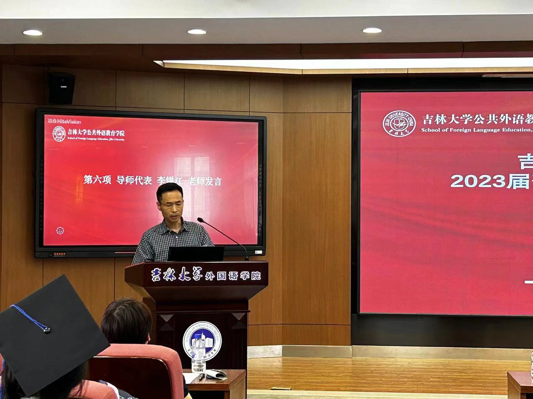 硕士研究生代表曲哲同学代表2023届全体毕业生向长期以来给予全心关怀、教导和帮助的领导示以最隆重的感谢,对老师的培育示以最崇高的敬意。她感叹时光瞬息,吉大公外见证了自己初生牛犊的盲目自信变得谦逊踏实,从肆掠青春的浮夸躁动变得务实奋进。三年的校园时光,是最美好的青春。满怀着对学院的不舍与感激,曲哲同学希望公共外语教育学院欣欣向荣、再谱华章,祝愿吉林大学再创辉煌。