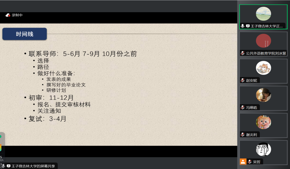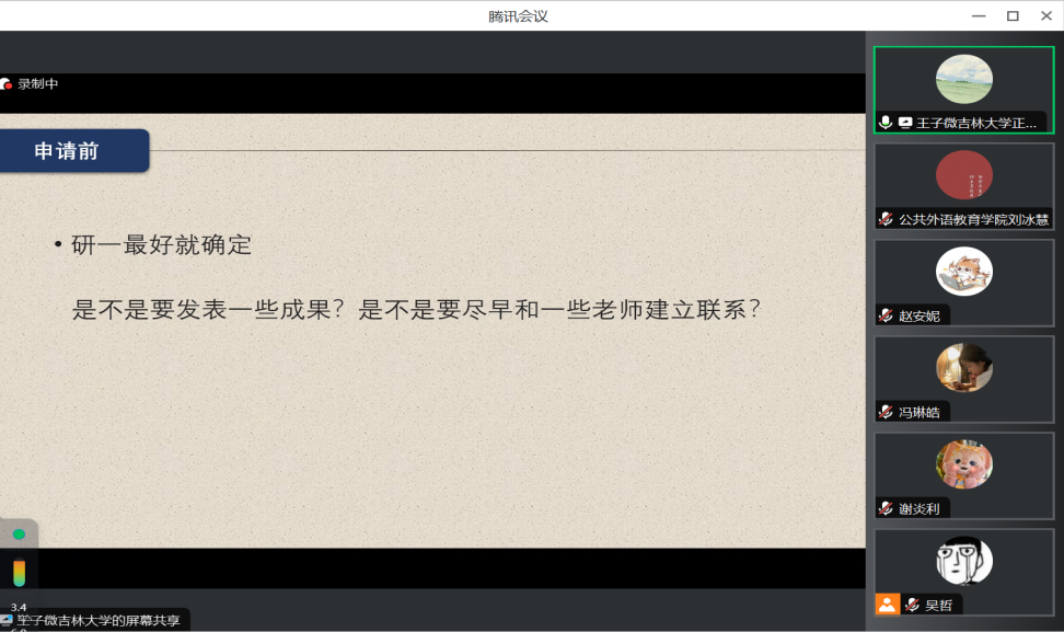 为提高人才培养质量,帮助硕士研究生了解和规划考博升学,明晰未来发展方向,11月28日晚7点,公共外语教育学院借助腾讯会议平台开展了“就业领航——考博升学”经验分享会。此次分享会由学院就业兼职辅导员吴哲同学主持,2023级博士研究生王子微同学主讲,各年级研究生同学积极参与。