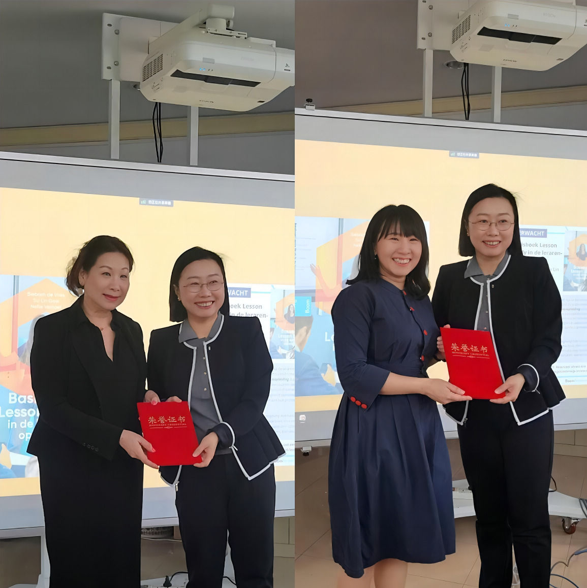 潘海英院长代表学院对两位专家的到访表示欢迎,并为两位专家颁发了荣誉证书,以感谢她们为我院教师专业发展提供的可操作性指导和帮助。同时,潘院长表示期待未来能有更多的合作机会,共同推动大学外语教育的转型和发展。