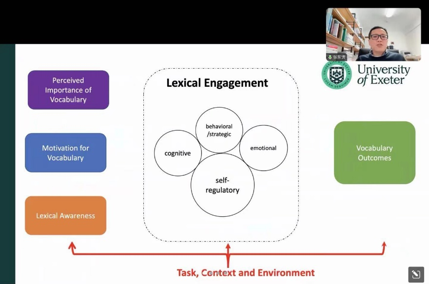 为推动促进我院科学研究工作的深入发展,公共外语教育学院于20241116日晚邀请国际知名二语阅读和词汇习得领域专家、英国埃克塞特大学张东波教授举办线上学术讲座。本次讲座由学院主管科研工作副院长张锦教授和二语习得方向学术带头人李锡江教授共同主持。本学院教师、各年级博士研究生、硕士研究生参加了此次讲座。